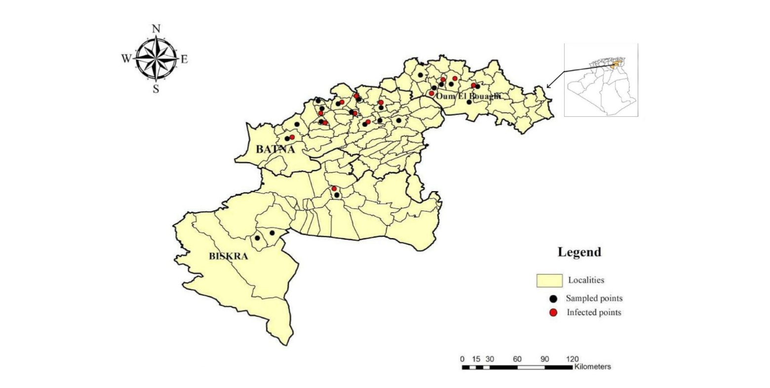 In Algeria, CanL is well established, particularly in the northern and northeastern regions. Particularly high prevalence rates have been reported in the wilayas of Sétif (69.17%), Bouira (62.5%) (Medkour et al., 2020), and Tiaret (68%) (Bia et al., 2022). Conversely, lower rates have been reported in Saïda (6%) (Tabet Aoual & Ammam, 2022) and in the Kabylie region (35.7%) (Medkour et al., 2019). A meta-analysis conducted over the period 2004–2022 estimated the average prevalence at 21.2% in the country (Touhami Khelifi et al., 2022). This spatial variability can be attributed to differences in ecological conditions, surveillance practices, and the diagnostic methods used.