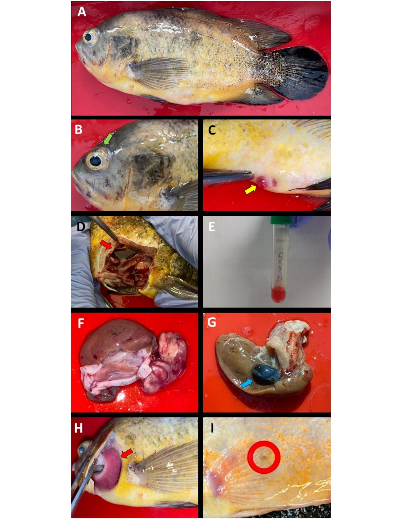 Figure. 1. Photomacrograph of Oscar fish (<em>Astronotus</em><strong> </strong><em>ocellatus</em>) with ascites and panexophthalmia. (A) Affected fish in the current study. (B) Exophthalmia (green arrow). (C) Cloacal haemorrhage (yellow arrow). (D) Ascitic fluid within the coelomic cavity (red arrow). (E) Whole blood collected in a lithium-heparin tube. (F, G) Liver without apparent lesions; gallbladder showing signs of cholecystitis (blue arrow). (H) Gills exhibiting marked pallor, indicative of compromised anaemia status (red arrow). (I) Argulus sp. infestation of observed on the external surface of the host (red circle).