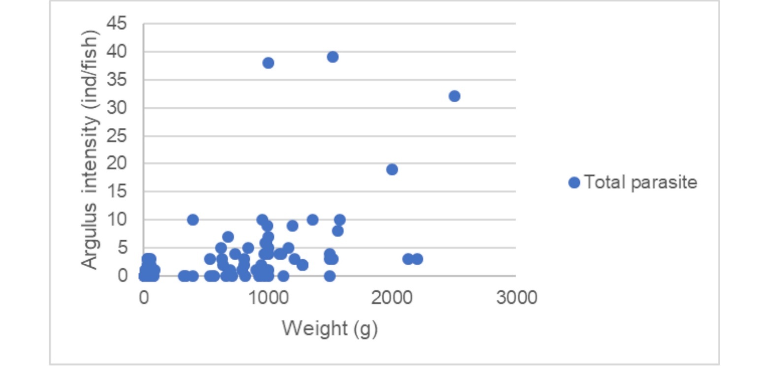 Figure. 3. Correlation between the intensity of <em>Argulus</em> <em>foliaceus</em> infestation and body weight of the host <em>Cyprinus</em><strong> </strong><em>carpio</em>. The data points represent the number of Argulus/individual fish examined (n = 210), which include the total number of parasites found on head, fins, and body from broodstock (n = 60) and fingerlings (n = 150). Note that A. foliaceus was not detected on gills.