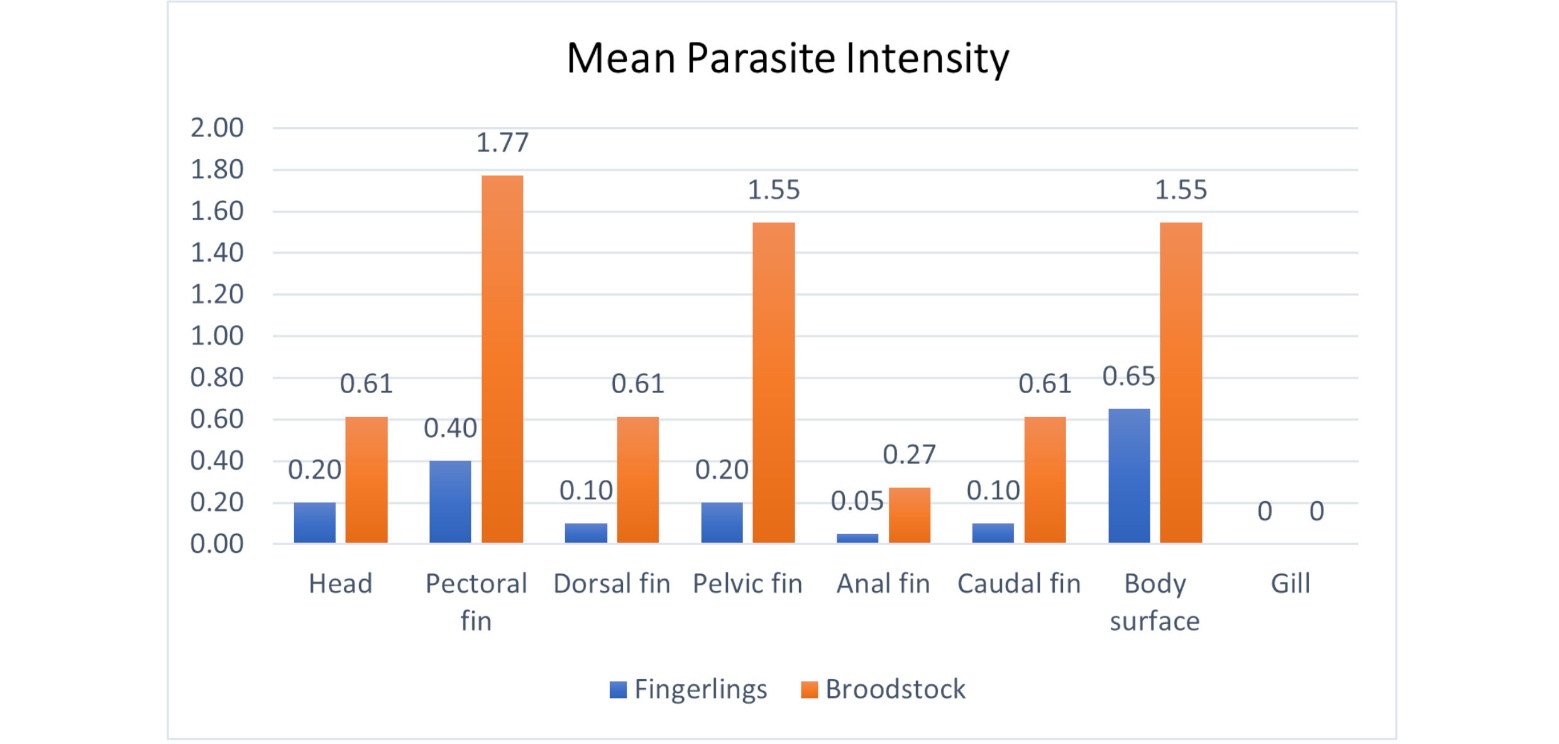 Figure. 4. Microhabitat of <em>Argulus</em> <em>foliaceus</em> in carp (<em>Cyprinus</em> <em>carpio</em>) broodstock (n = 60) and fingerlings (n = 150). The mean intensity of parasite infestation for each microhabitat is the average number of <em>Argulus</em> present on each body part of individual host fish examined.