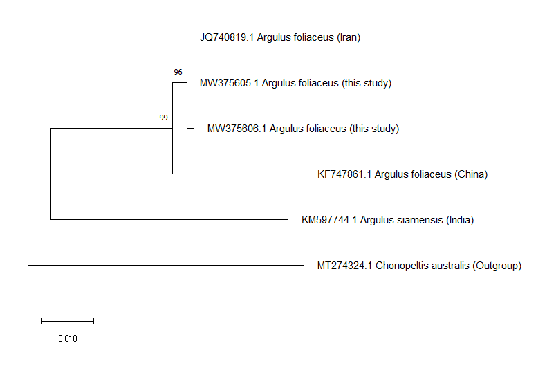 Figure. 2. Phylogenetic relationship of <em>Argulus</em> <em>foliaceus</em> from this study (accessions MW375605 and MW375606) with the most closely related <em>Argulus</em> sequences in the NCBI GenBank. The phylogenetic tree was generated using the Maximum Likelihood method with the Kimura-2 parameter model (Kimura, 1980) and the numbers on the branches of the tree represent bootstrap values.