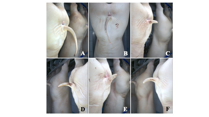 Figure. 1. Tail-biting lesions in slaughtered pigs. Large necrotic–ulcerative lesions on the tip of the tail stump (A, B). An undocked tail missing its flat tip, which is scarred and deformed (C). Ulcerative lesion on the lateral surface of the tail (D). Healed partial (E) and complete (F) tail loss.