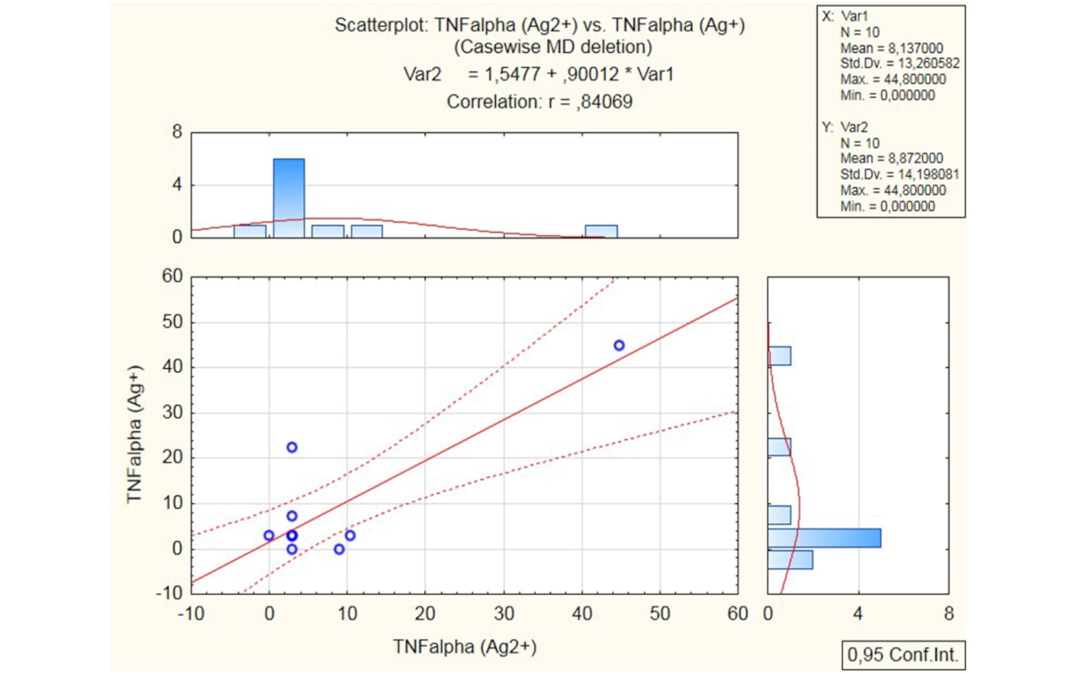 Out of 14 dogs with the diagnosis of HWD, Ag was detected in 12 dogs (7 dogs with Ag ++ and 5 dogs with Ag+), while mf were detected in 9 dogs. The dogs belonged to class 1 (6 dogs), class 2 (5 dogs) and class 3 (3 dogs), without any dog classified in class 4 (CS). At the moment of HWD diagnosis, TNF-α was detected in 9 dogs with the average value of 7.21±12.44 pg/ml (0-44.80). However, during therapy, TNF-α was detected in two more dogs in which initially TNF-α was not detected. Besides, in one dog in which TNF-α was detected at the beginning of the therapy, later on during the course of therapy it was not detected. There were variations in TNF-α concentration during the therapy, with the average values of 7.21±12.44 pg/ml (x1) at the beginning, 4.69±11.64 pg/ml (x2) in the middle and 5.65±9.05 pg/ml (x3) at the end of the therapy.However, these changes were not statistically significant. There were no statistically significant differences in TNF-α concentration changes in relation to different Ag levels. Changes of TNF-α concentration were not related to the changes of Ag level during the therapy. However, correlation between TNF-α concentration for Ag++ (8.14±13.26 pg/ml) and TNF-α concentration for Ag+ (8.87±14.20 pg/ml) in dogs during the therapy was significant (r=0.84) (figure 1). Concentrations of TNF-α in dogs with different HWD class were 5.94±9.01 pg/ml (class 1), 3.51±3.29 pg/ml (class 2) and 15.89±25.08 pg/ml (class 3), with no statistically significant difference.