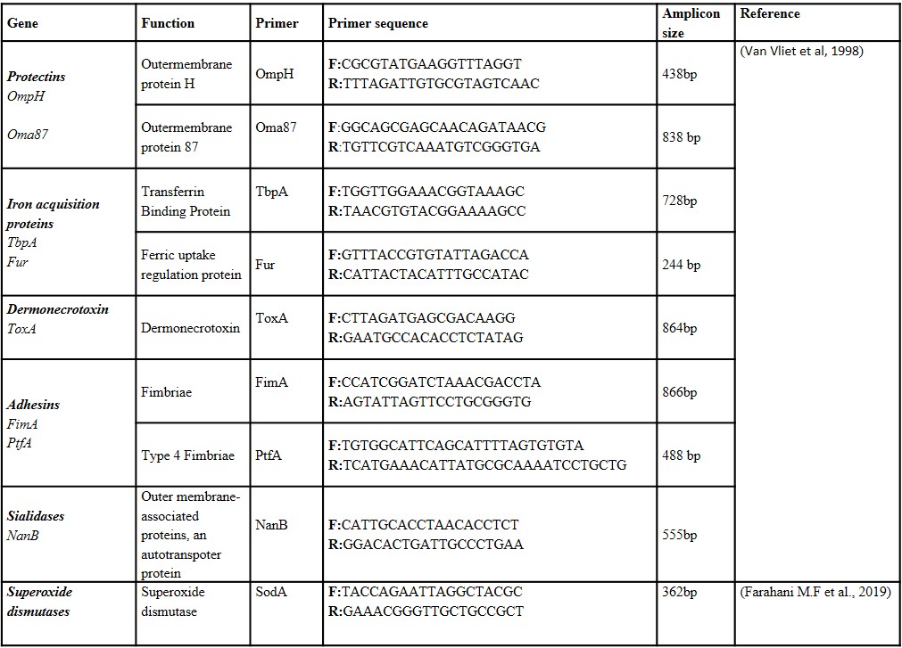 Aski H,S & Tabatabaei M. 2016. Occurrence of virulence-associated genes in Pasteurella multocida isolates obtained from different hosts. Microb. Pathog, 96, 52-57. doi: 10.1016/j.micpath.2016.04.008.