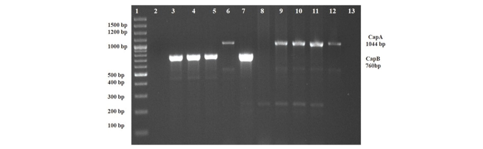 Figure. 2. Multiplex PCR for detection of capsule biosynthesis genes of P. multocida. Lane 1: 100 bp DNA ladder, Lanes 2, 8 and 13: No template controls, Lanes 3, 4, 5 and 7: CapB isolates showing an amplicon of 760 bp, Lanes 6, 9-12: CapA isolates showing an amplicon of 1044 bp.