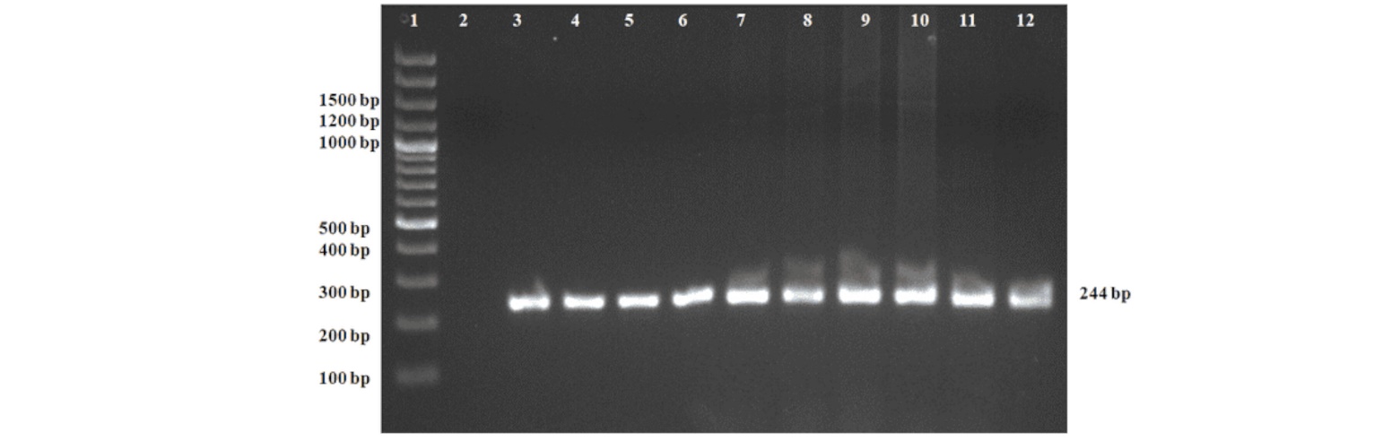 Figure. 6. PCR for detection of fur gene of P. multocida. Lane 1: 100 bp DNA ladder, Lane 2: No template control, Lanes 3-12: Positive isolates showing an amplicon of 244 bp.