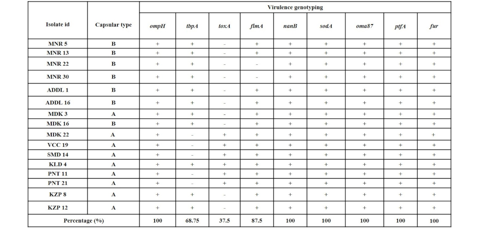 In epidemiological studies now-a-days, virulence associated genes are being extensively targeted for bacterial pathogen detection and differentiation (Prajapati et al. 2020). The overall percentage of virulence genes among the isolates were found to be 100% for ompH, nanB, sodA, oma87, ptfA and fur, 87.5% for fimA, 68.75% for tbpA and 37.50% for toxA among all the isolates. The association of virulence genes to capsular types A revealed 44.44%, 66.66% for tbpA and toxA, respectively whereas capB isolates revealed 100% for tbpA, 71.40% for fimA and none of the capB isolates harboured toxA gene. In our study, all the isolates (100%) harboured ptfA and nanB gene irrespective of capsular types indicating the pathogenic potential of the isolates. Similar findings (100%) have also been reported by previous studies on sheep and bovine isolates of P. multocida in India (Hatfaludi et al. 2010, Prabhakar et al. 2012, Verma et al. 2013, Sarangi et al. 2015).