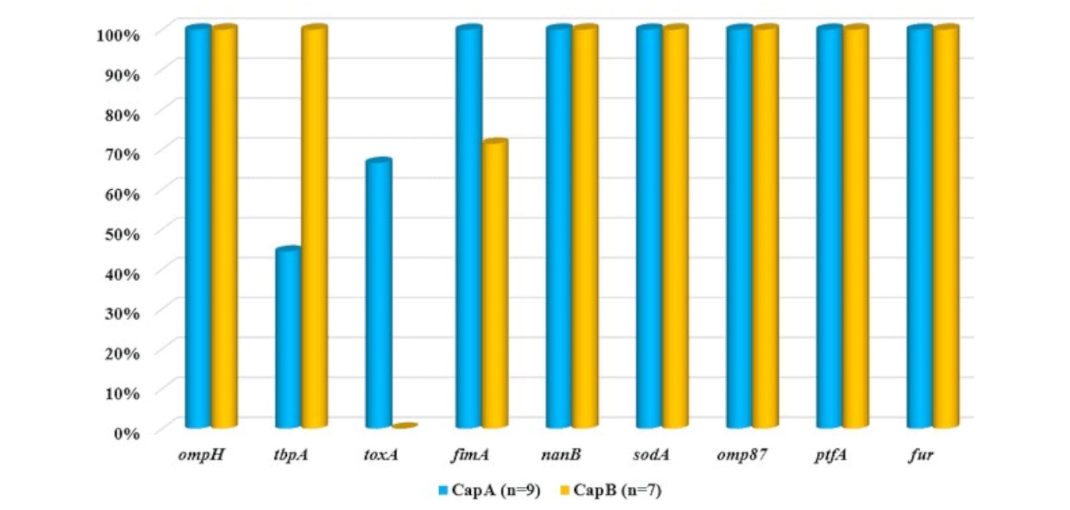 However, the prevalence of 3 virulence genes varied among the capsular types A and B. The fimA gene was found to be present in all the 9 (100%) isolates of capsular type A but was detected in only 5 (71.4%) capB isolates. The tbpA gene was observed to be present in 4 (44.4 %) isolates of capsular type A but was found in all the 7 (100%) capB isolates. The toxA gene was found to be detected in 6 (66.6%) capA isolates while none of the capB isolates possessed toxA gene. Details of the association of capsular types to virulence genes were shown in (Table V) and described in (Figure 9).