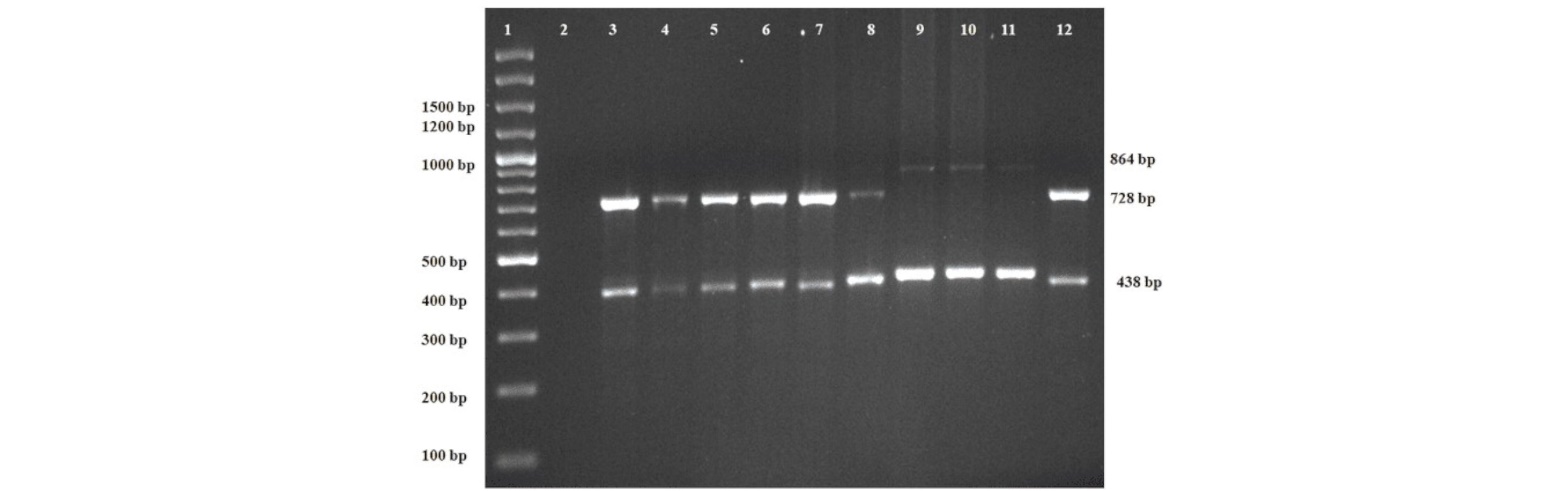 Figure. 3. Multiplex PCR for detection of ompH, tbpA and toxA genes of P. multocida. Lane 1: 100 bp DNA ladder, Lane 2: No template control, Lanes 3-8 and 12: Isolates positive for ompH (438 bp) and tbpA (728 bp), Lanes 9-11: Isolates positive for ompH (438 bp) and toxA (864 bp).