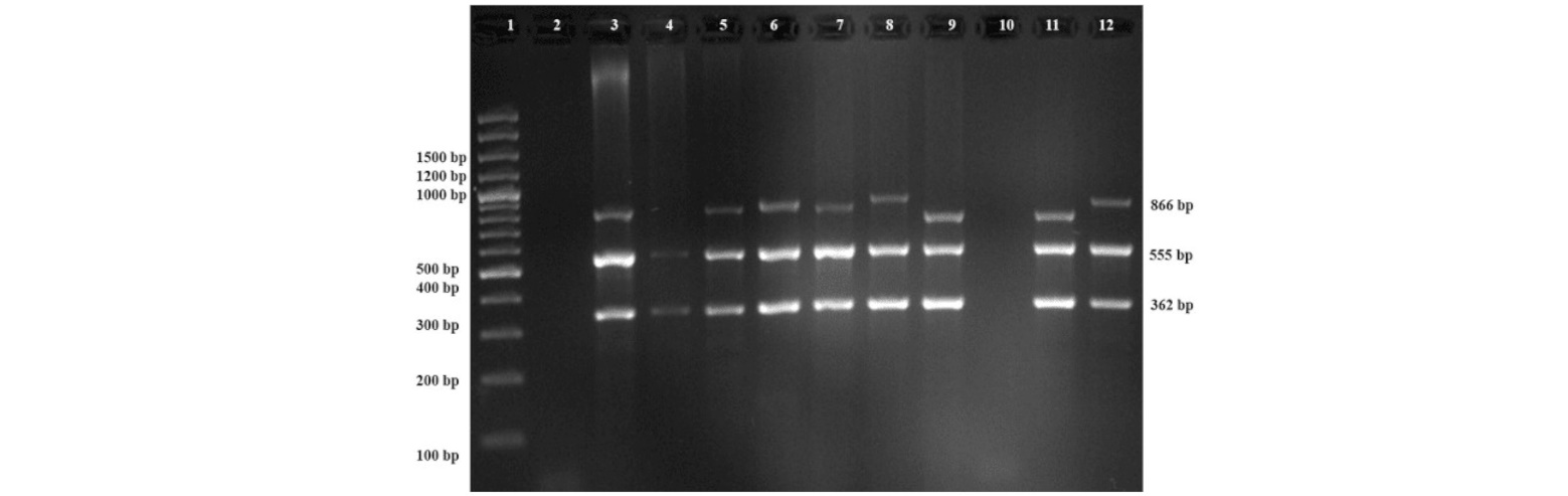 Figure. 4. Multiplex PCR for detection of fimA, nanB and sodA genes of P. multocida. Lane 1: 100 bp DNA ladder, Lane 2 and 10: No template controls, Lanes 3-8 and 12: Isolates positive for sodA (362 bp), nanB (555 bp) and fimA (866 bp), Lanes 9 and 11: Isolates positive for sodA (362 bp), nanB (555 bp) and fimA (788 bp).