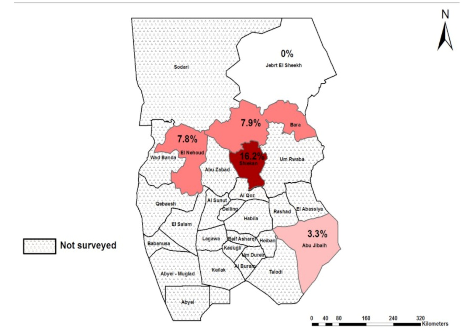 Figure. 2. The prevalence of camel brucellosis in some localities in Kordofan States (North, West and South).