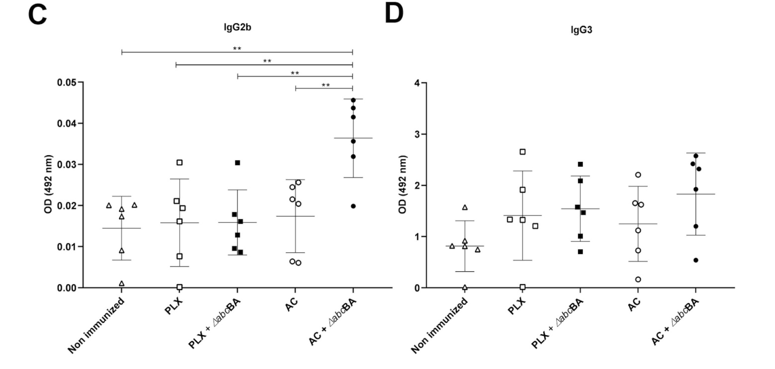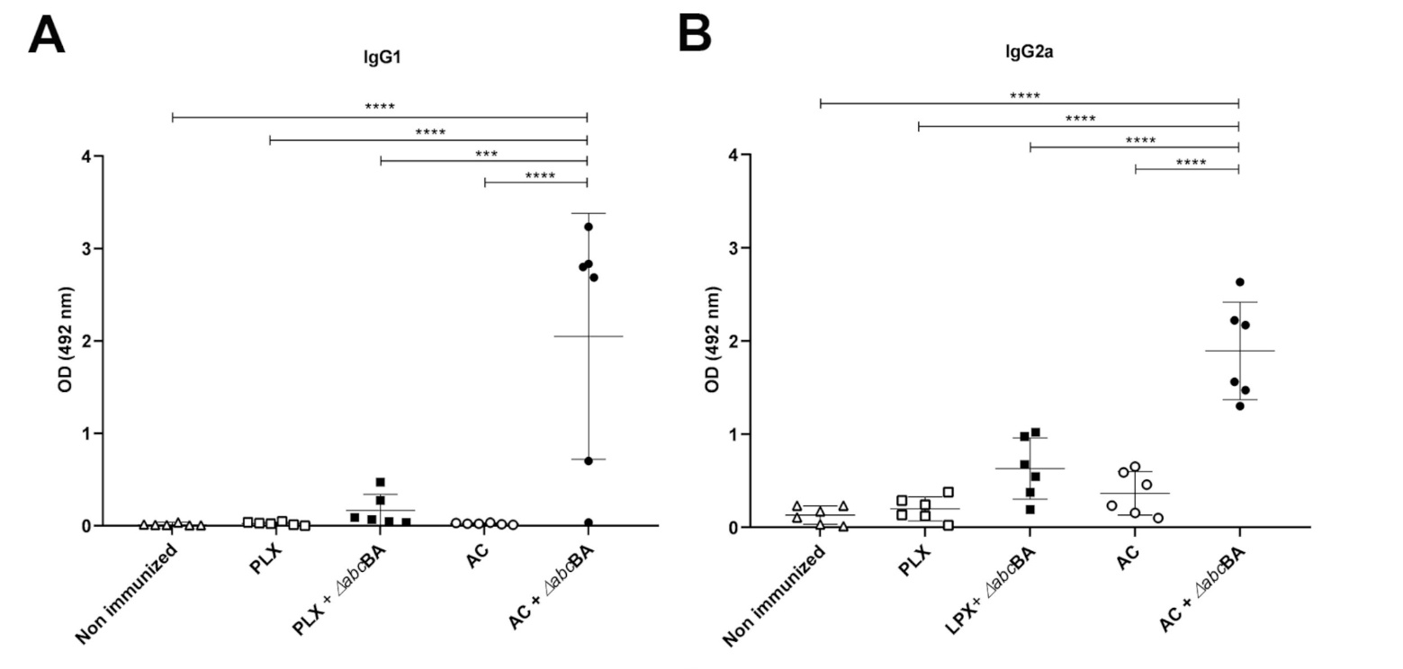 Then were evaluating the IgG subclasses, a significant increase in the levels of IgG1, IgG2a and IgG2b subclasses was observed in the mice immunized with AC+∆abcBA compared to the other groups (Figure 7).