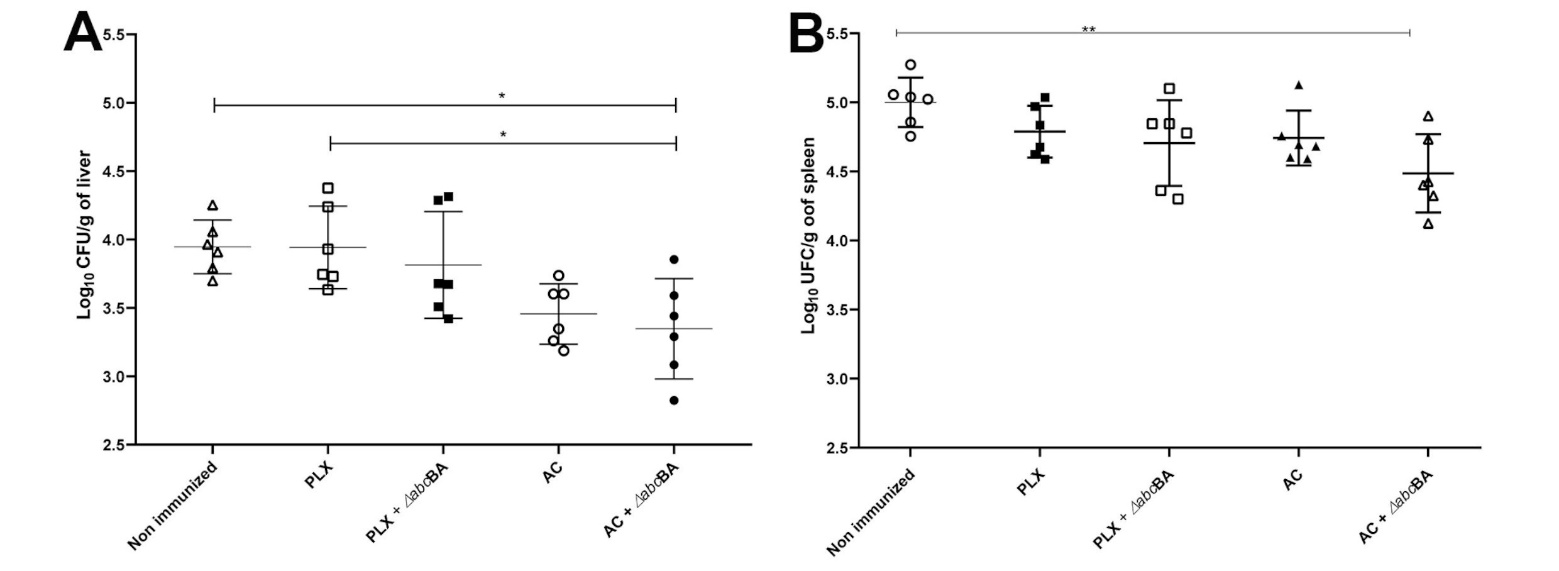 Figure. 4. Bacterial recovery from liver (A) and spleen (B) of female C57BL/6 mice (n = 6) immunized subcutaneously with PBS (non-immunized), copolymer (PLX), PLX + B. ovis ∆abcBA (PLX+∆abcBA), alginate and chitosan capsules (AC), and B. ovis ∆abcBA encapsulated by alginate and chitosan (AC+∆<em>abcBA</em>) and subsequently challenged with the wild strain of <em>B.</em><strong> </strong><em>ovis</em>. Data are expressed as individual animals (points) and mean with standard deviation. Results were log-transformed before being subjected to ANOVA and compared by Tukey's test. Statistical differences are represented by asterisks (* p < 0.05, ** p < 0.01).