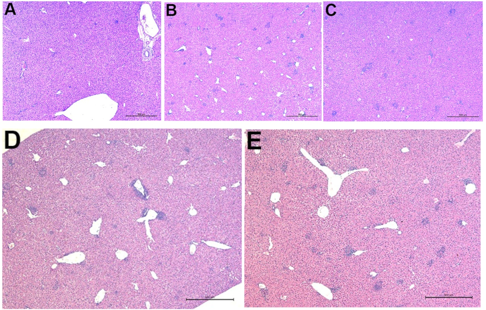 Figure. 5a/e. Histopathological evaluation of the liver of female C57BL/6 mice (n = 6) immunized subcutaneously with Brucella ovis ∆abcBA encapsulated by alginate with chitosan (AC+∆abcBA) represented by black circle (A), AC by empty circle (B), copolymer + <em>B.</em><strong> </strong><em>ovis</em> ∆<em>abcBA</em> (PLX+∆<em>abcBA</em>) Black square (C), PLX by empty square (D) and PBS (non-immunized) empty triangle (E).