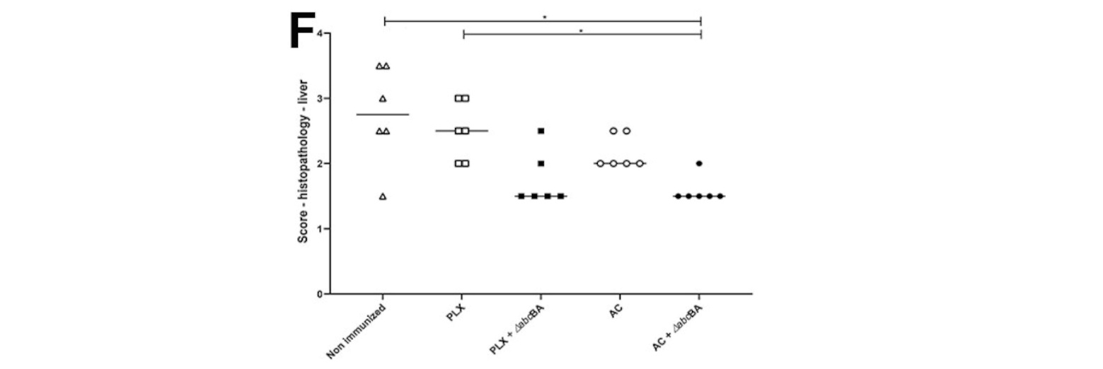 Microscopically, liver of unvaccinated mice infected with B. ovis exhibited multifocal areas of intense inflammatory infiltrate composed of macrophages and neutrophils (microgranulomas), associated with multifocal random areas of necrosis (Figure 5). Similar lesions were observed in the liver of the non-immunized animals were also observed in mice of the PLX, AC and PLX+∆abcBA groups (Figure 5). However, mice immunized with AC+∆abcBA developed less severe lesions in the liver (p < 0.05) compared to the other groups (Figure 5).Therefore, vaccination with B. ovis ∆abcBA encapsulated in alginate and chitosan resulted in reduction of bacterial colonization in liver and spleen with less severe inflammatory lesions in liver after challenge with the wild type B. ovis strain.