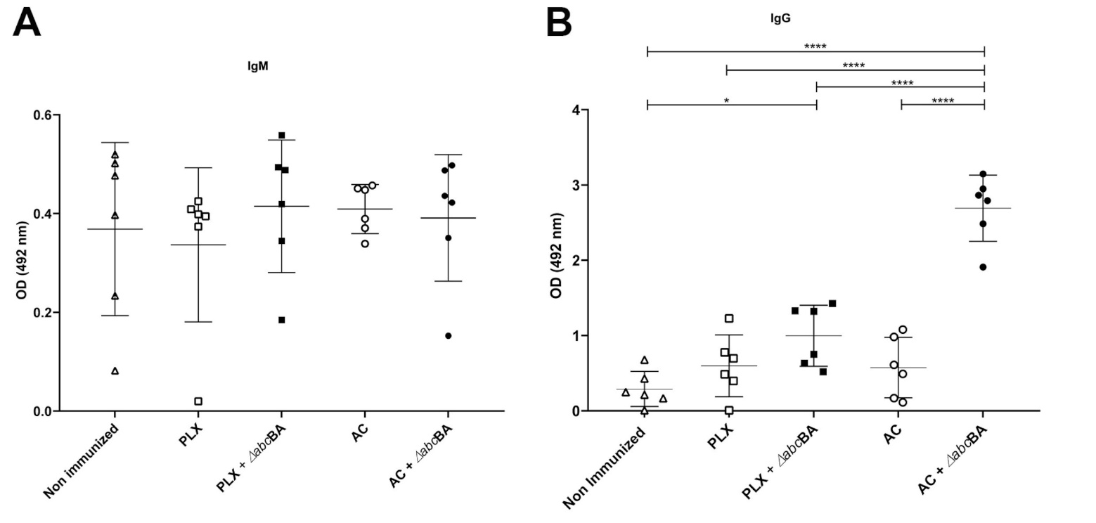 Figure. 6. Determination of total IgM (A) and IgG (B) levels by ELISAi of serum from female C57BL/6 mice (n = 6) immunized subcutaneously with PBS (non-immunized), copolymer (PLX), PLX + B. ovis ∆abcBA (PLX+∆abcBA), alginate and chitosan capsules (AC), <em>B.</em><strong> </strong><em>ovis</em> ∆<em>abcBA</em> encapsulated by alginate and chitosan (AC+∆<em>abcBA</em>) and subsequently challenged with the wild strain of <em>B.</em><strong> </strong><em>ovis</em>. Data are expressed as individual animals (points) and mean with standard deviation. Results were analyzed for normality before being subjected to ANOVA, with the mean values compared by Tukey's test. Statistical differences are represented by asterisks (* p < 0.05, **p < 0.01, ***p < 0.001, ****p < 0.0001).