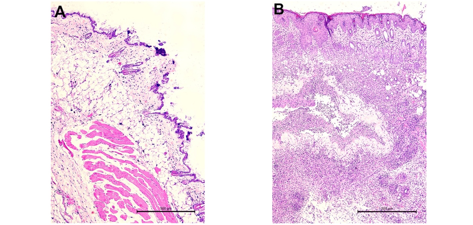 Figure. 3a/b. Histopathology of vaccine inoculation skin site of female C57BL/6 mice (n = 6) 42 days after subcutaneous immunization with PBS (non-immunized) (A) and B. ovis ∆abcBA encapsulated by alginate and chitosan (AC+∆abcBA) (B).