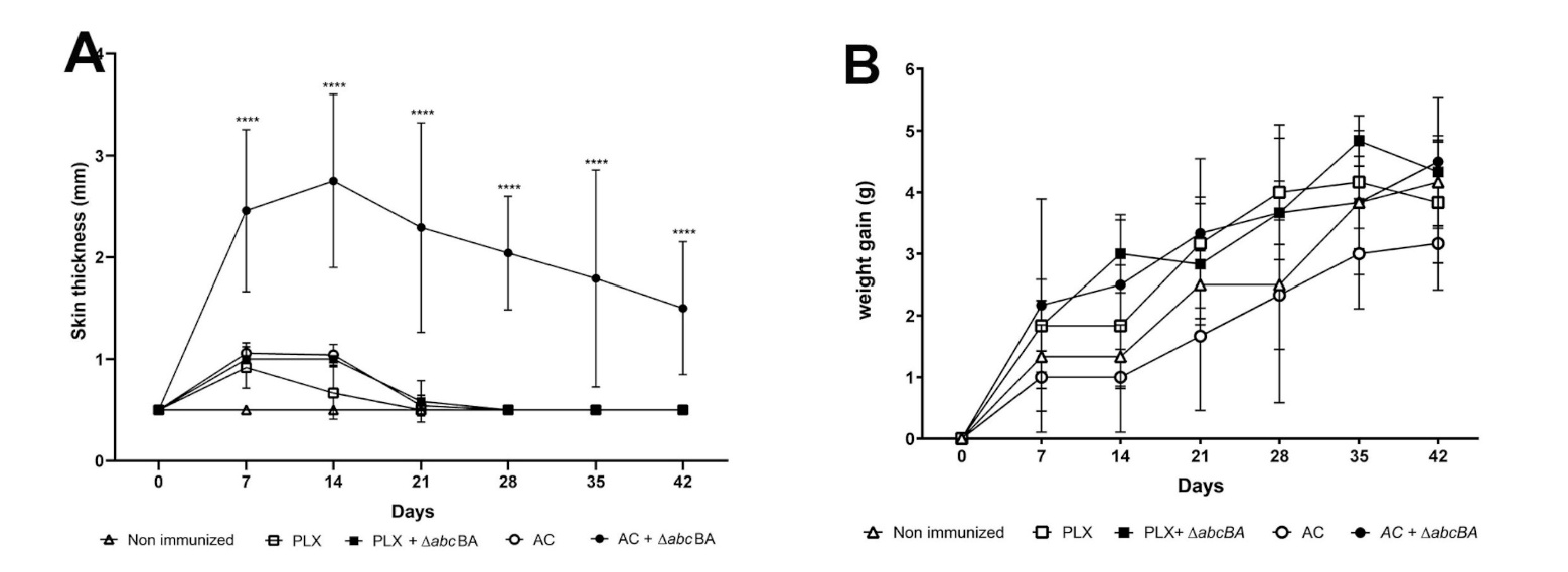 Previous studies demonstrated that the use of alginate and chitosan microcapsules elicits an exacerbated inflammatory response at the inoculation site when associated with vaccine antigen (Rocha et al. 2021). Therefore, formulations containing alginate and chitosan in this study were applied at two inoculation sites. The vaccine formulations containing PLX were applied at a single inoculation site. When we evaluated the inoculation site of the animals immunized with polymeric adjuvants, only the animals immunized with AC+∆abcBA had significant local changes. Immunization of mice with AC+∆abcBA caused a progressive increase in skin thickness, which peaked at 14 days but remained until 42 days after inoculation (Figure 2A). Three mice immunized with AC+∆abcBA developed a fistula, draining purulent-looking contents. Discomfort during handling for daily weighing was observed in all mice of the AC+∆abcBA group. No change in behavior was observed in the animals of the other groups. Despite the changes in the inoculation site, there were no differences in weight gain between the groups throughout the course of the experiment (Figure 2B).