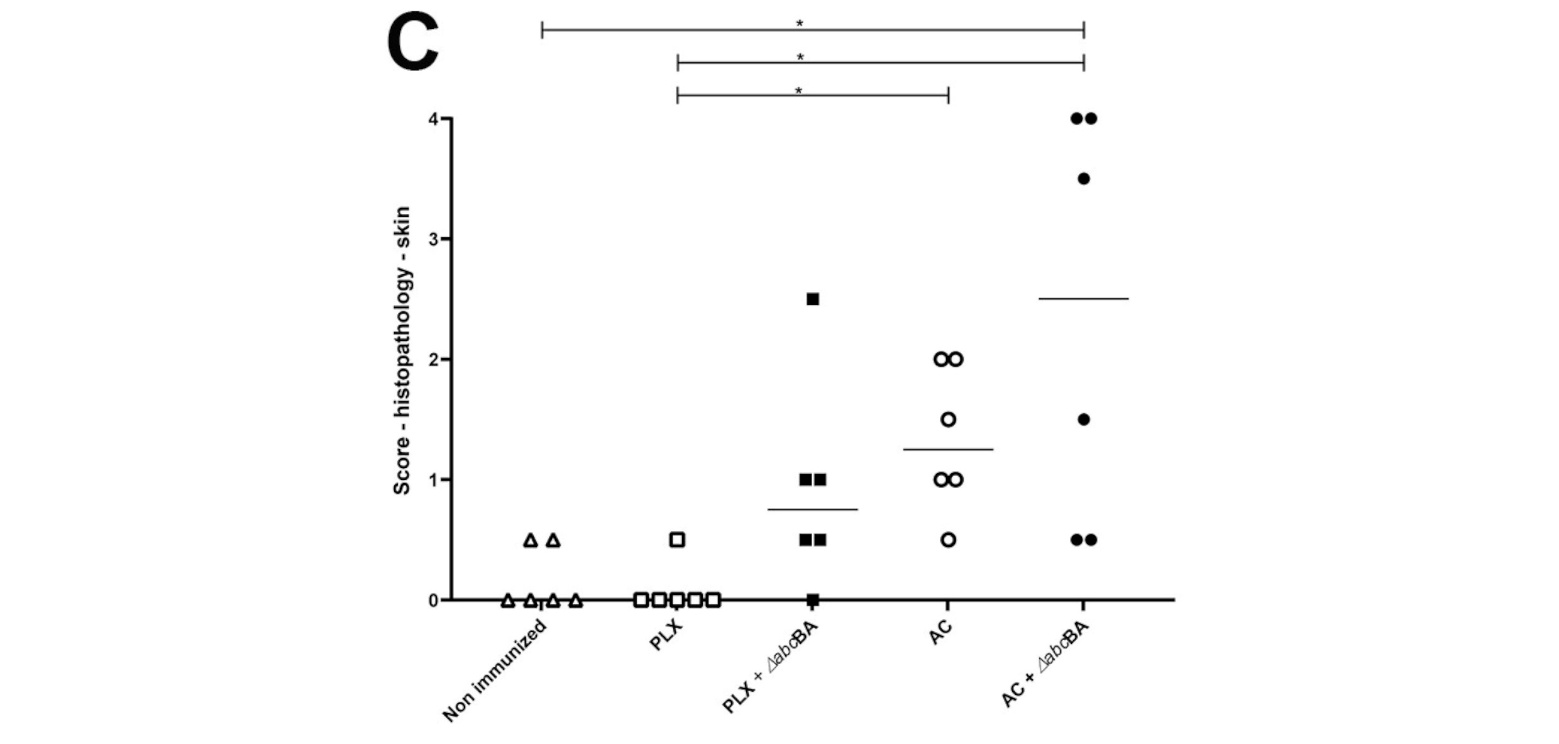 Histology of the skin at inoculation sites sampled at 42 days after immunization, demonstrated a chronic inflammatory lesion in the skin of AC+∆abcBA mice. The dermis presented intense and diffuse inflammatory infiltrate that extended from the superficial dermis to the deep dermis, composed of macrophages with foamy cytoplasm, neutrophils, and some lymphocytes and plasma cells, associated with acanthosis, multifocal areas of moderate necrosis, and marked fibroblastic proliferation. In addition, moderate multifocal deposition of hyaline-looking content was observed associated with the lesion. In contrast, skin from mice in the AC, PLX or PLX+∆abcBA group exhibited mild local inflammatory reaction, characterized by the presence of a discrete number of macrophages, rare lymphocytes and plasma cells, with this inflammatory infiltrate being observed mainly in the deep dermis region, in addition to no histological changes were observed in the skin of unvaccinated mice (Figure 3).