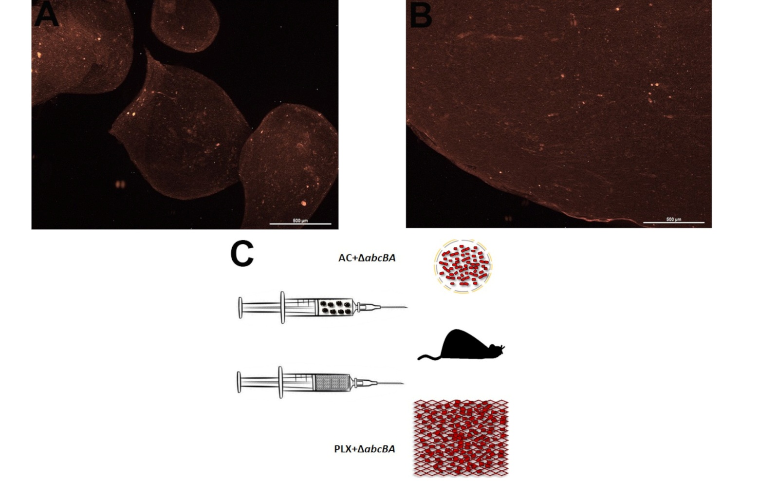 Figure. 1. Fluorescence microscopy image demonstrating numerous red bacteria (Brucella ovis ∆abcBA expressing mCherry) associated with alginate capsules with chitosan (A) or the copolymer PLX (B). Schematic figure vaccine formulations - polymers associated to mCherry <em>B.</em><strong> </strong><em>ovis</em> (C).