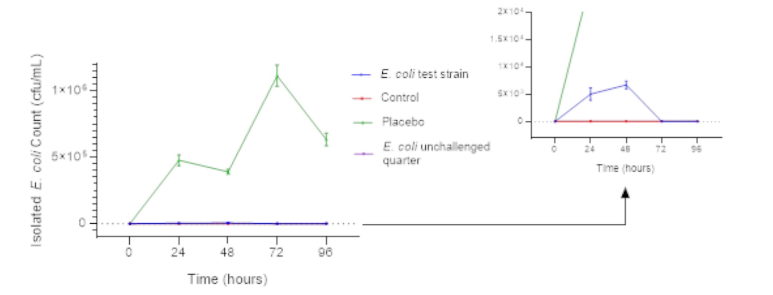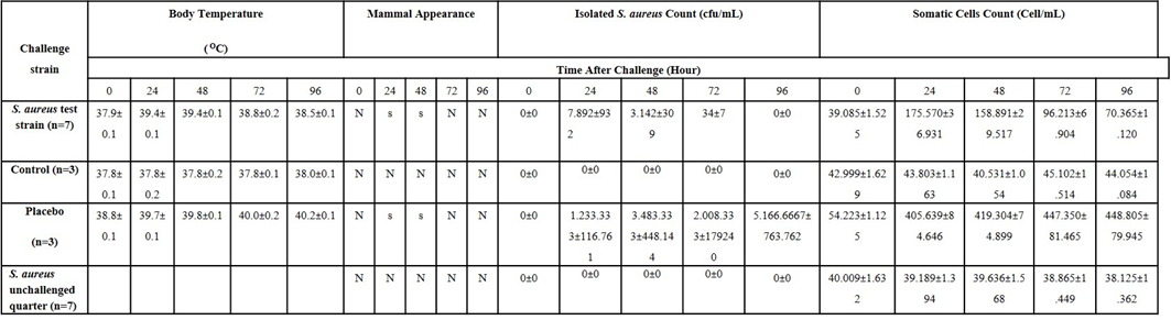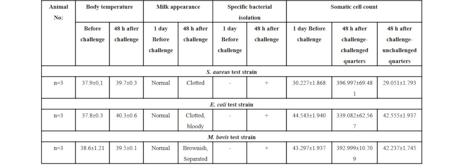Parameters examined in animals after the pathogenicity study were rectal temperature, appearance of milk, bacterial count in milk samples, somatic cell count, and general clinical signs.