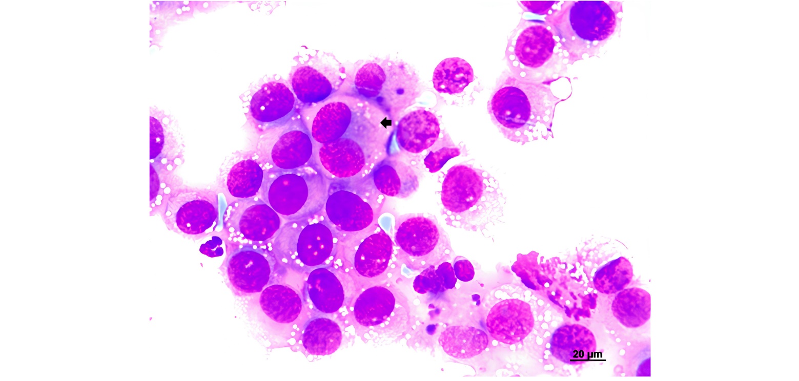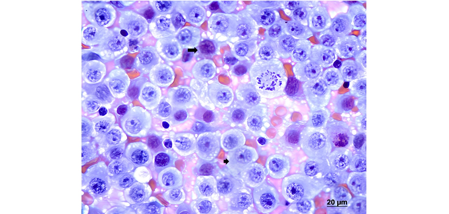 Figure. 1. Canine transmissible venereal tumor. Expression of the malignancy criteria. Note the binucleation (arrow); hyperchromasia; speckled chromatin. Staining by Giemsa, 630x.