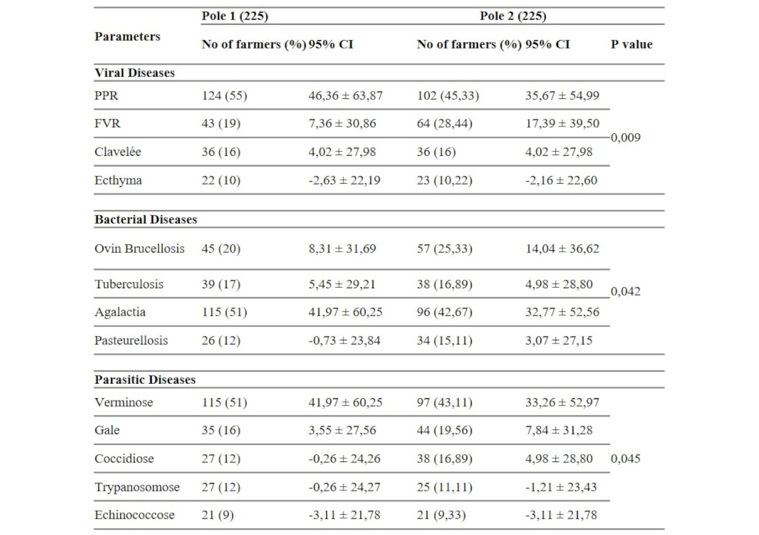 Table VIII shows the main observed symptoms and the suspected diseases based on these symptoms by the farmers and veterinary agents present during the discussion groups. Similarly to the discussions, individual surveys revealed that the suspected pathologies in the livestock were PPR (55.11% and 45.33% in pole 1 and 2, respectively), Rift Valley fever (19.11% and 28.44% in pole 1 and 2, respectively), scabies (15.56% and 19.56% in pole 1 and 2), digestive verminoses (51.11% and 43.11% in pole 1 and 2, respectively), agalactia (51.11% and 42.67% in pole 1 and 2, respectively), brucellosis (20% and 25.33% in pole 1 and 2, respectively), trypanosomiasis, and coccidiosis (12% and 11% in pole 1 and 2, respectively), contagious ecthyma (9.78% and 10.22% in pole 1 and 2, respectively), and echinococcosis (9.33% in pole 1 and 2, respectively) (table VIII). These different diseases were most frequently mentioned, although some had a greater impact than others (p=0.009, p=0.042, and p=0.045, respectively, for diseases of viral, bacterial, and parasitic origin).