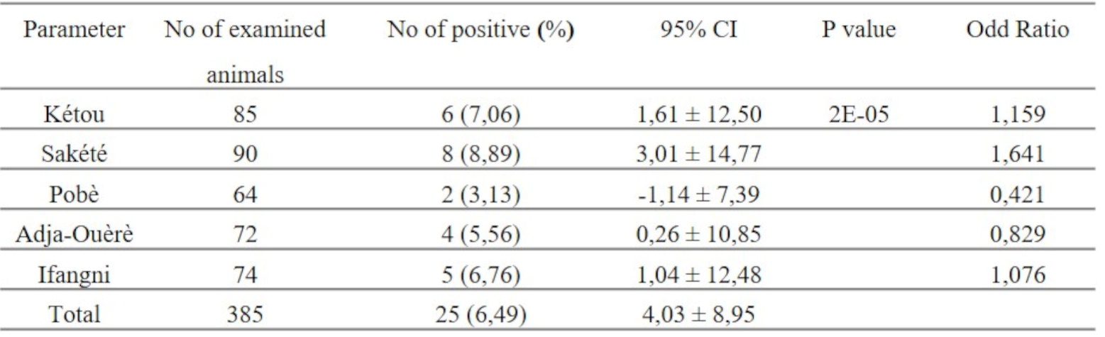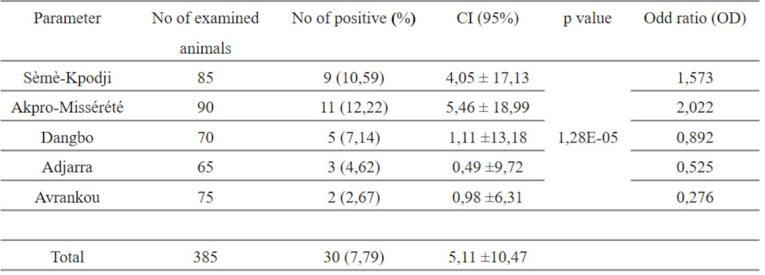 The investigation centred on the prevalence of C. abortus infection in small ruminants inhabiting five municipalities within the Pole 1 and Pole 2, located in Southern Benin. The findings have unveiled noteworthy disparities among these distinct geographical areas at a significance level of p < 0.05. The prevalence of C. abortus infection was notably elevated in the municipalities of Sakété and Kétou in Pole 1 (Table II). Most notably, the municipality of Akpro-Missérété exhibited the highest prevalence, closely trailed by Sèmè-Kpodji (Table III), both situated within the Pole 2. It is essential to highlight those animals in Sakété (with an Odds Ratio of 1.641) and Akpro-Missérété (with an Odds Ratio of 2.022) bore a significantly higher risk of C. abortus infection when contrasted with their counterparts in other municipalities.