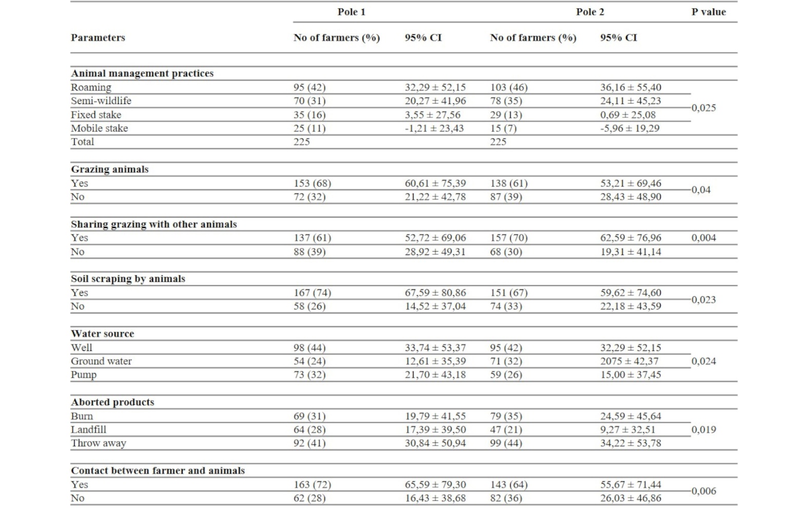 All the farmers surveyed (100% of respondents) practice different management methods for their animals throughout the year, adapting these practices according to the season. Roaming is the most common method, accounting for 42% in pole 1 and 46% in pole 2. Other methods such as semi-claustration, mobile stakes and fixed stakes are also used on other farms, in proportions of 31%, 16% and 11% respectively for pole 1, and 35%, 13% and 7% for pole 2. These management methods were the most commonly observed on the farms visited (p < 0,03) in both poles. Most farmers (68% for pole 1 and 61% for pole 2, p < 0,04) periodically took their animals to pasture. Unfortunately, a majority of these farmers (61% and 70% respectively for pole 1 and pole 2, p < 0,004) share the pasture with other animals whose health status is unknown.