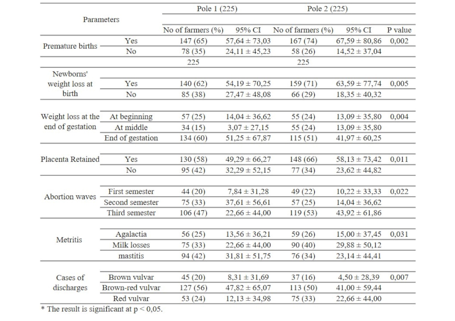 Questioned farmers provided answers concerning the presence of Enzootic Ovine Abortion disease on the farms visited, focusing on Chlamydia abortus (table IV). In poles 1 and 2, respectively 65% and 74% of farmers reported frequent cases of premature birth (p < 0,002) and birth weight loss in newborns (62% in pole 1 and 71% in pole 2) (p < 0,005). Weight loss in pregnant ewes and goats was mainly observed at the end of gestation according to 59.56% of breeders in pole 1 and 51.11% in pole 2, although it could also occur at other times (p < 0,004). With regard to cases of retained placenta, 58% and 66% of farmers indicated that this was common on farms in pole 1 and 2 respectively (p < 0,011). Furthermore, a majority of abortion waves were observed in the third trimester of gestation (47% in pole 1 and 53% in pole 2), although significant cases of this wave were also observed in the first two trimesters (p < 0,022). With regard to cases of metritis, 42% and 33% of farmers in pole 1 and 34% and 40% in pole 2 respectively reported cases of udder inflammation and milk losses on their farms (p < 0,03). In addition, 56% and 50% of farmers reported cases of reddish-brown vulval discharge in pregnant goats and ewes during parturition (p < 0,007) (table I).