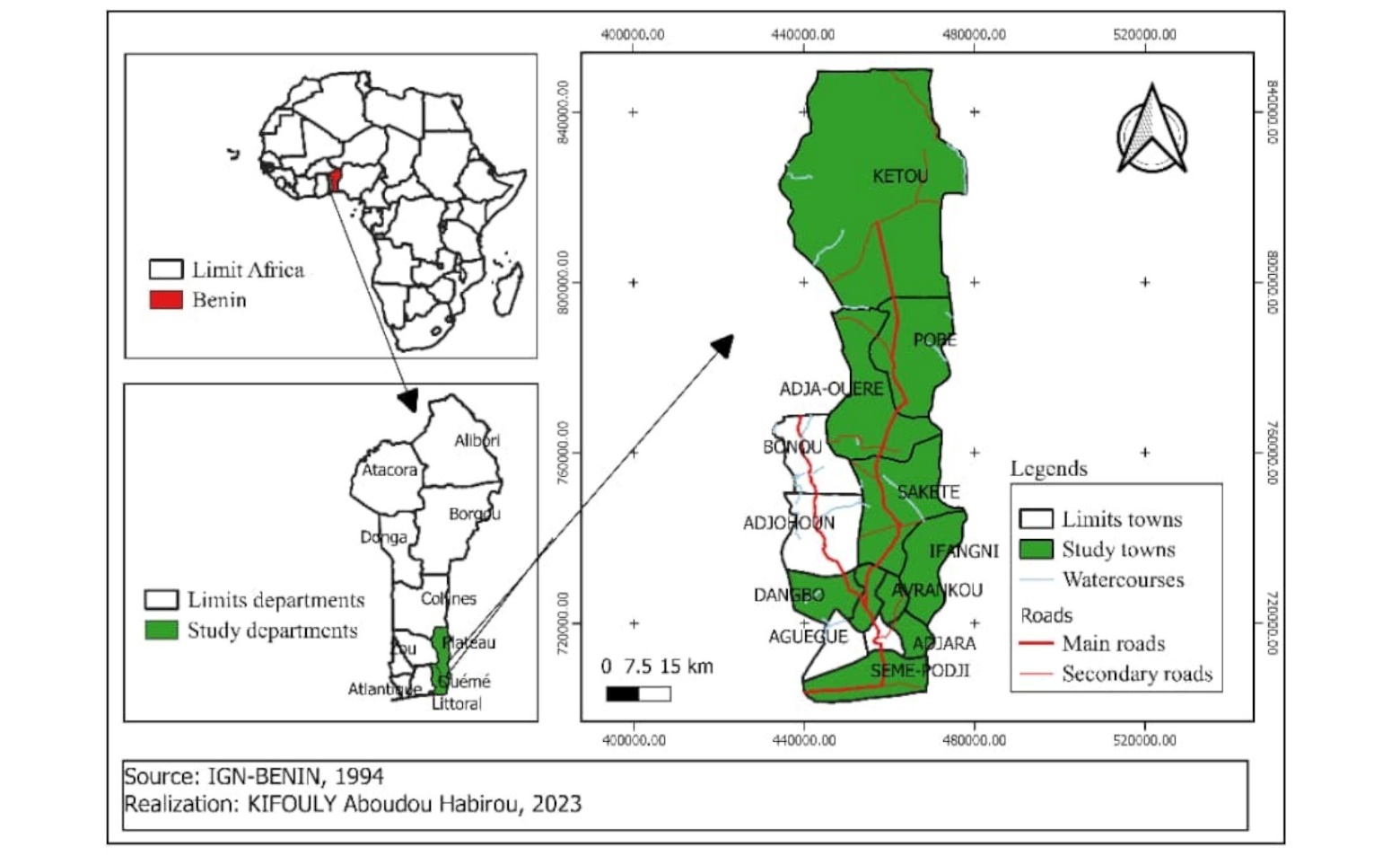 The study was conducted in Benin's southern region, which encompasses six departments and is home to three of the country's seven Agricultural Development Poles (PDA). These poles, which are key elements of the agricultural development strategy, were planned taking into account the agro-climatic conditions and specific potential of each region of the country. Among the poles in this region, pole 1 is located in the south of the country and is mainly dedicated to food tree cultivation. This area is also home to transhumant herds, requiring careful management of the agro-salvo-pastoral space. Pole 1 is dedicated to crop diversification, with a particular focus on oil palm, food crops, cassava, and rice plantations. Finally, Pole 2 focuses more on fishing and market gardening activities in the river-lagoon regions of southern Benin, as well as in the Mono and Ouémé valleys. These two poles (Pole 1 and Pole 2) were chosen in the southern part of Benin, which has a subtropical climate with two rainy seasons (April to July and September to October) interspersed with two dry seasons. March is the hottest month, while August is the mildest.