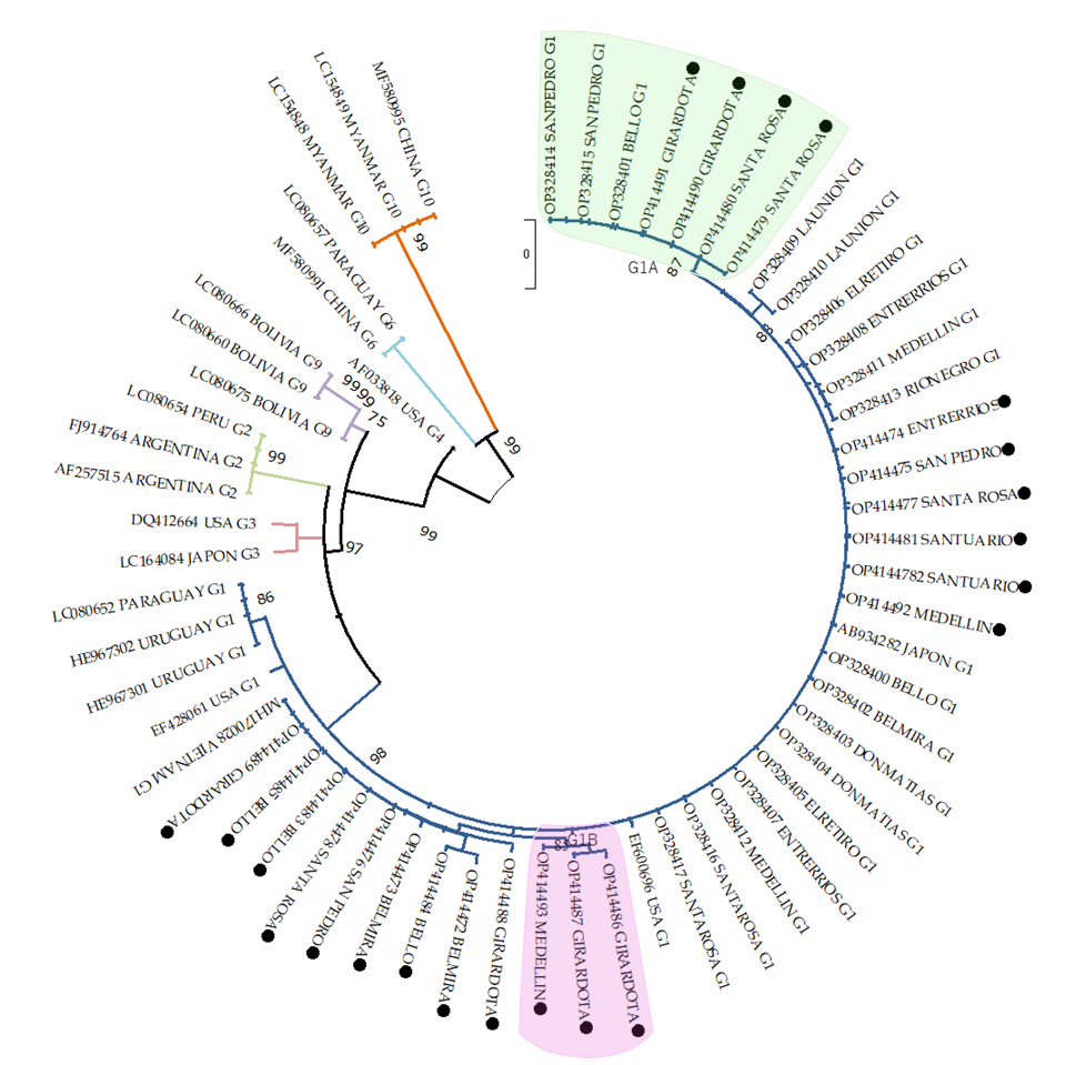 In both phylogenetic trees, two subclades of G1A and G1B are highlighted (Figures 2 and 3). The first highlighted in green has four sequences (OP414480, OP414490, OP414491, and OP414479) recorded in this study, along with three sequences obtained from the north and Valle de Aburrá areas of the Department of Antioquia (OP328415, OP328414, and OP328401) (Úsuga-Monroy et al. 2023). Therefore, it could be considered a new subtype of genotype 1 (G1A), considering branch supports of 87% obtained with the maximum likelihood and 100% with the Bayesian methods. The other subclade highlighted in pink locates three study samples (OP414439, OP414487, and OP414486) with branch supports of 85% obtained with the maximum likelihood and 86.92% with the Bayesian methods.