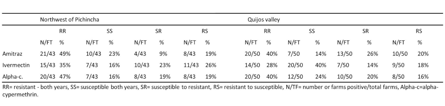 In the first year, 67.21% (41/61), 57.38% (35/61), and 67.21% (41/61) of farms in NP were resistant for amitraz, ivermectin, and alpha-cypermethrin, respectively. In QV, 61.54% (40/65), 43.08% (28/65), and 60% (39/65) were resistant to the same acaricides. In the second year, percentages of resistant farms were 59.45% (28/47), 57.45% (27/47), and 68.09% (32/47) in NP, and 64.15% (34/53), 43.51% (22/53), and 66.04% (35/53) in QV, respectively for the same acaricides. There were no statistical differences between years, locations and acaricide (chi-square p-values >0.05).