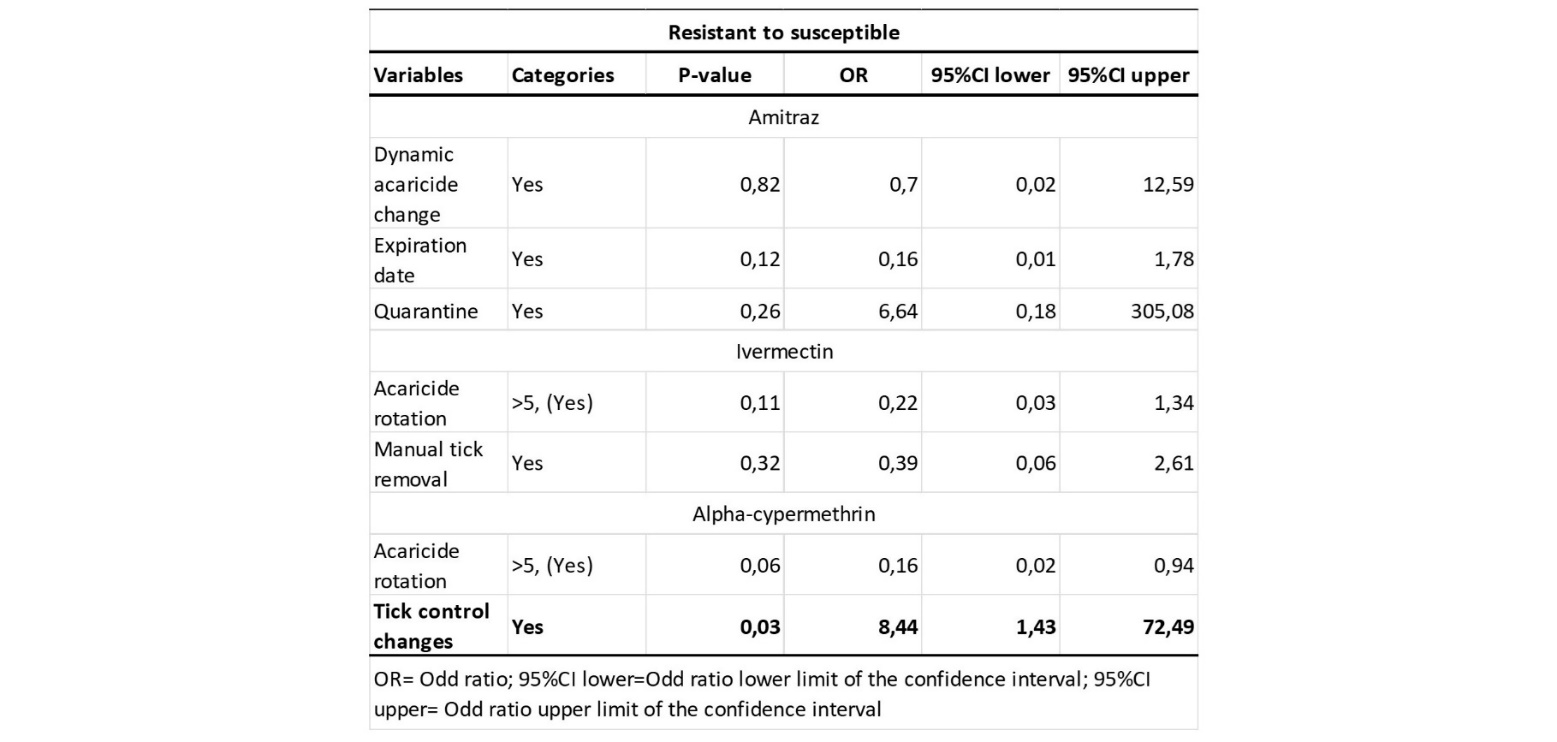 Risk factors associated with acaricide resistance differed between zones. While (Rodríguez-Vivas et al., 2006) failed to identify any factors associated with resistance to similar acaricides, our findings emphasize that management variables identified as associated are significant and applicable regardless of the specific acaricide they were statistically linked to.