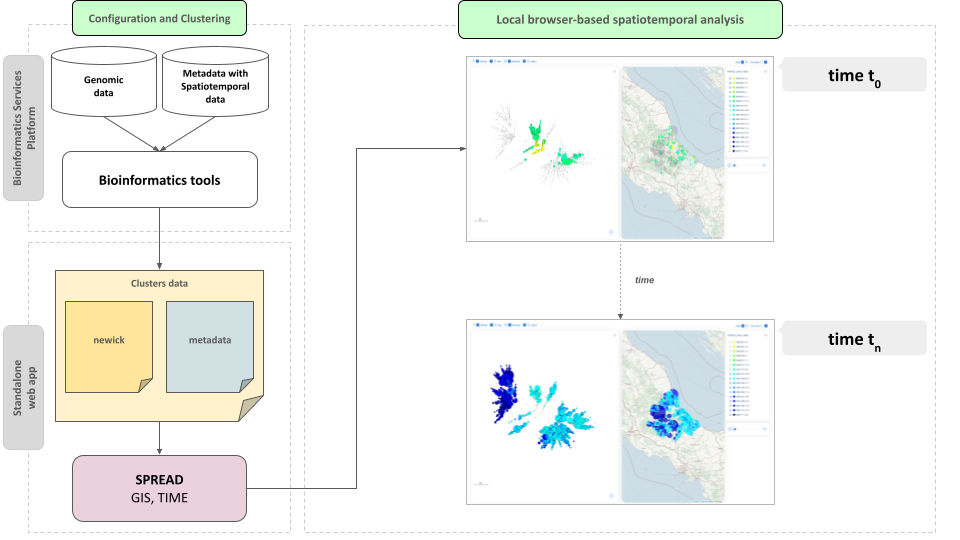 Figure. 2. Schematic representation of the data analysis workflow within SPREAD, emphasizing the seamless integration of genomic, temporal, and geographic data produced by bioinformatics service platform.