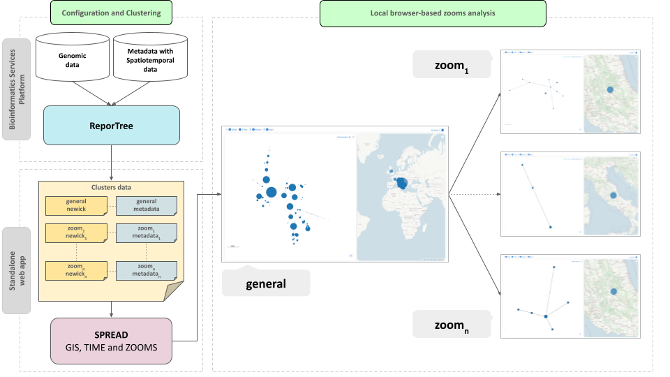 Figure. 3. Schematic representation of the data analysis workflow within SPREAD, highlighting the integration of genomic, temporal, and geographic data based on ReportTree output. SPREAD enables one-click zoom functionality for detailed cluster examination, without losing the context of the broader genomic landscape.