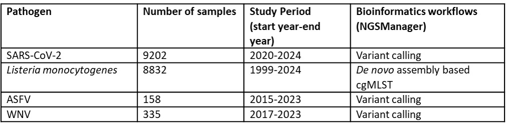 The genomic samples used in this proof of concept were collected by IZSAM via the GENPAT information system, a national platform based on a fork of the COHESIVE information system (Mangone et al., 2021), within the framework of both national and European surveillance initiatives (Table 1). Additionally, the NGSManager bioinformatic pipeline (https://github.com/genpat-it/ngsmanager) of the GENPAT platform (https://genpat.izs.it/) was used to process paired-end reads and/or long reads. More precisely, bacterial genomic samples of L. monocytogenes underwent processing through a de novo assembly-based cgMLST workflow, developed for the Listeria National Reference Laboratory. This workflow involved the use of fastp (version 0.23.1) (Chen, 2023), shovill (version 1.1.0) (https://github.com/tseemann/shovill) and chewBBACA (version 2.8.5) (Silva et al., 2018), culminating in the generation of allelic profiles combined into a single allele matrix file. Concerning viruses, genomic samples of SARS-CoV-2, ASFV, and WNV underwent variant calling workflows, implementing Trimmomatic (version 0.36) (https://github.com/usadellab/Trimmomatic), snippy (version 4.5.1) (https://github.com/tseemann/snippy) and vcf2mlst (Di Pasquale et al., 2021). The used reference genomes were Wuhan-Hu-1/2019, Georgia 2007/1, and NY99/Héja for SARS-CoV-2, ASFV, and WNV, respectively. The cgMLST-like outputs from both bacterial and viral workflows were also compatible with GrapeTree (version 1.5.0) (Zhou et al., 2018) and ReportTree (version 2.0.3) (Mixão et al., 2023). In summary, the developed standalone dashboard underwent testing using a substantial dataset, comprising 8832 L. monocytogenes, 9216 SARS-CoV-2, 158 ASFV, and 335 WNV samples (Table 1).