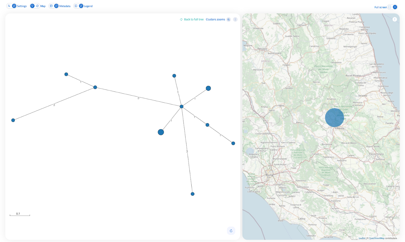 In instances of large genomic relationships, where identifying samples of interest becomes challenging, SPREAD is able to highlight, into the tree (i.e., GrapeTree (Zhou et al., 2018)) and related map (i.e., OpenStreetMap/Leaflet (Herfort et al., 2021; Edler and Vetter, 2019)), those pathogens from the collection which are genetically close to pathogens defined by users, based on a threshold setting used to delineate clusters of interest identified by ReportTree (Mixão et al., 2023) (Figure 5). This mechanism is typically employed in surveillance activities when new samples must be used to query a historical database of samples, in order to swiftly retrieve genetically close pathogens which may share the same epidemiological origin.In addition to the navigation through genetically close pathogens, the users can also restrict the view of tree and map to samples belonging to specific genomic clusters, in order to refine the hypotheses about transmission pathways and sources (Figure 6).