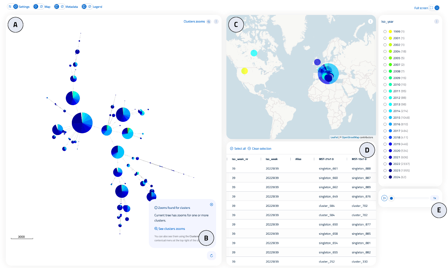 Figure. 1. Overview of SPREAD: GrapeTree for the visualization of the tree (A), ReportTree for zoom functionality (B), OpenStreetMap and Leaflet to map nodes to represent geographic distribution (C), Ag-Grid for listing and filtering metadata (D), and JavaScript for a timeline component to visualize the context over time (E).