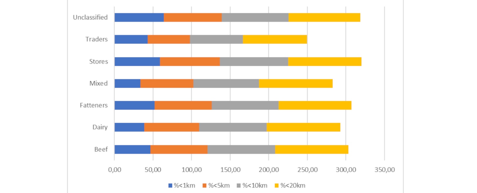 Farms in Ireland are digitally recorded on a Land Parcel Identification System (LPIS) (European Court of Auditors, 2016). LPIS is a series of IT systems based on aerial or satellite photographs recording agricultural parcels in many EU Member States. It is a key control mechanism under the Common Agricultural Policy (CAP) designed to verify eligibility for area-based subsidies, which amounted to approximately €45.5 billion in 2015 (from: ECA 2016). Having land parcel outlines digitized allows for interrogation by Geographical Information Systems (GIS) (Zimmermann et al., 2016). Ireland’s LPIS is managed by the Department of Agriculture, Food and the Marine (DAFM) on an Oracle® Spatial database. The data are comprised of a total of 130,385 farms of which a subset were defined as “active” farms registered as having bovine livestock in 2020 or 2021 (101,890). This was exported to ESRI® shapefile format for processing. Data on livestock populations were exported from DAFM’s Animal Health Computer System (AHCS). Farm enterprise type was assigned to herds based on the simplest category levels developed by Brock et al, 2022 consisting of; Dairy herds, (milk and calf productions systems), Beef herds, fattening herds (confinement feeding operations where cattle are fed primarily for finishing), Trading herds (characterised primarily on the basis of having a very low proportion of animals that remain in them for more than 30 days), mixed herds (dual purpose operators producing milk, but also having another cattle enterprise focused on beef production), stores (non-breeding herds with a focus on the rearing of young animals from the beef and dairy sectors) and “other” herds (herds falling outside of the aforementioned criteria).