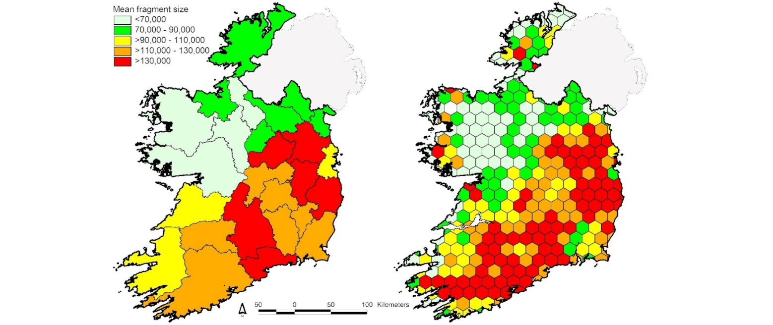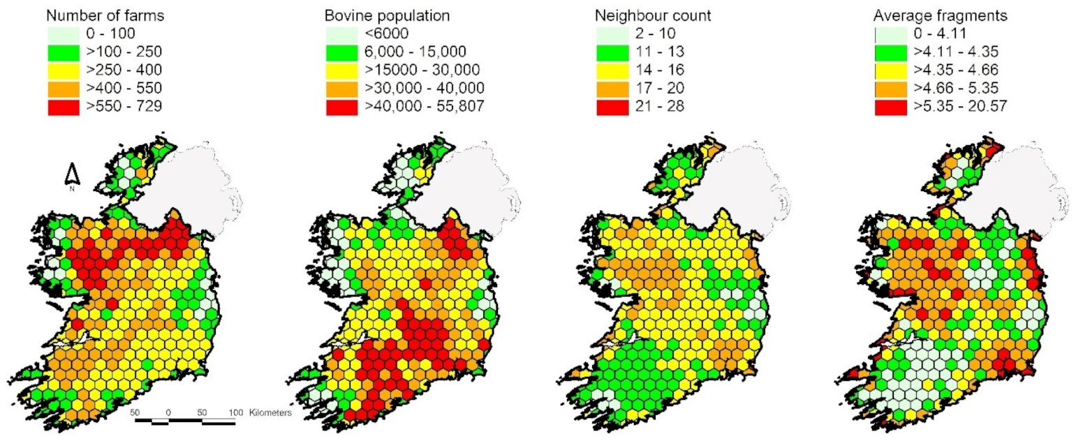 This study focuses on describing fragmentation on farms in Ireland, particularly farms stocked with bovines. There is great potential for exploring additional parameters. These data could be coupled to DAFM’s Animal Identification and Movement (AIM) metrics to build an extended “probability of contact” matrix or connectance index. Contrast metrics could be explored to build maps of neighbourhood diversity based on enterprise types, animal types, arable crop types, other non-agriculture land uses.