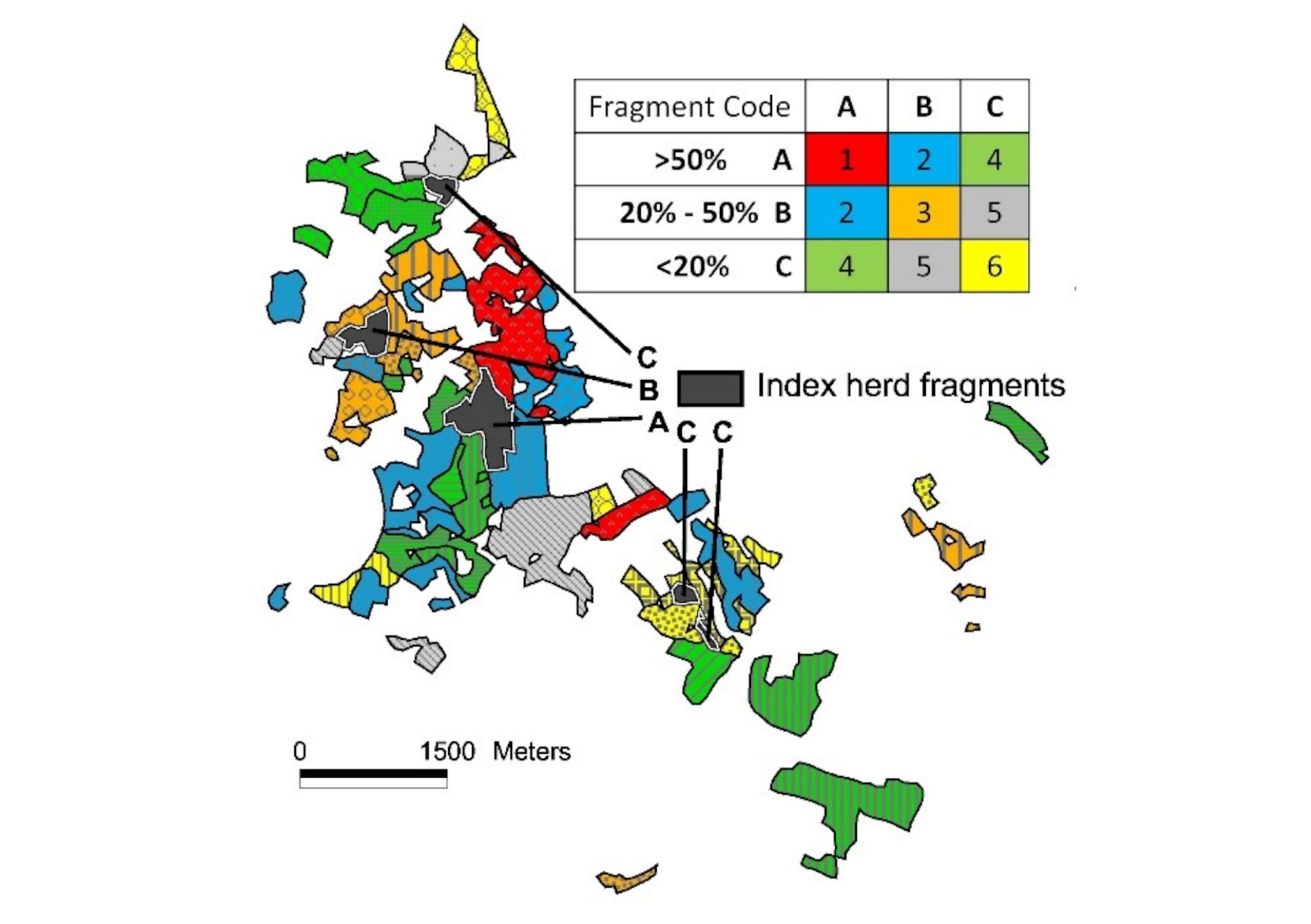 In terms of defining the potential influence of neighbouring farms in disease transmission, the “neighbourhoodness” index identifies which neighbouring farm fragments are likely to be of most significance. In the instance of the real-world example displayed Figure 1. The index farm (black), shares a boundary with 20 other farms (411 distinct fragments). However, the index farm’s largest fragment of land only shares a boundary with one other farm’s largest fragment of land (red). Coupled with the shared boundary length, current and historic stocking levels and disease history of the neighbouring farms, surveillance resources can be prioritised for active surveillance of bTB breakdowns and for managing outbreaks of transmissible diseases. The “neighbourhoodness” score can also be used to build relationships between farms for modelling purposes.