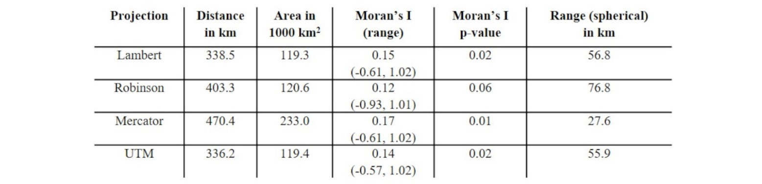 Moran’s I was estimated using the empirical Bayesian smoothed WNv incidence data for the 29 regions in Southern Ontario. The results are presented in Table I. The point of note is the p-value of Moran’s I, which is indicating the presence of clustering under the Lambert, Mercator and UTM projections, but not the Robinson projection. Similar, the range of a semi-variogram of a GLGM stands out as much longer than range estimates for alternative projections (Table II). However, p-values reported should be interpreted as exploratory and used cautiously (Matthews et al., 2017).