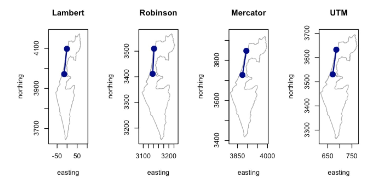 Figure. 1. Maps of Israel for the Robinson, UTM, Mercator and Lambert projections. The dots and connecting lines represent the distance and direction between the cities Rehovot and Haifa in the middle and north of the map, respectively. All coordinates are in km. The euclidean distances by projection from left to right are: Lambert 127 km, Robinson 98km, Mercator 122 km and UTM 103 km.