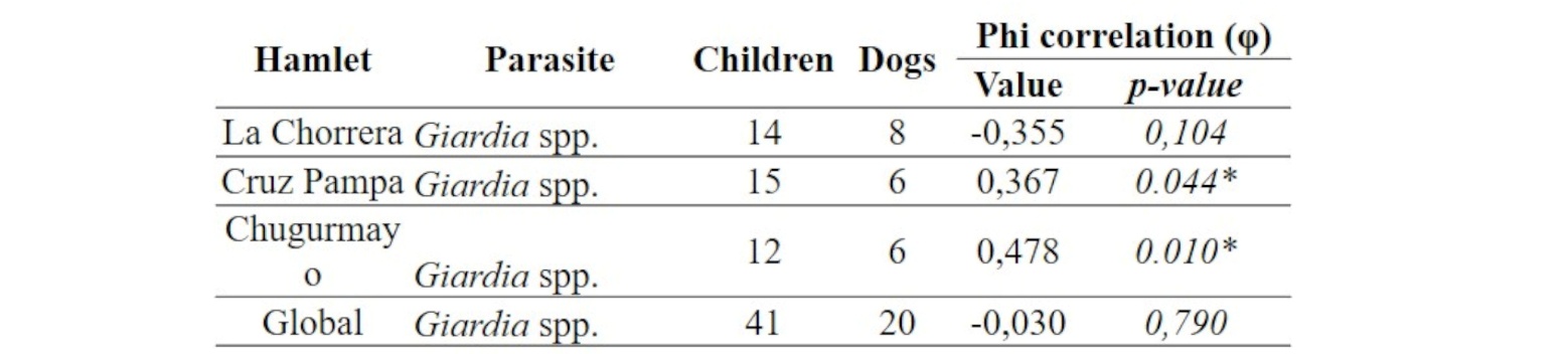 Table. IV. Correlation between the occurrence of common parasitic stages in children and dogs from three hamlets in the Sorochuco district, Celendín (Cajamarca, Peru). *Statistically significant correlations are indicated (p < 0.05).