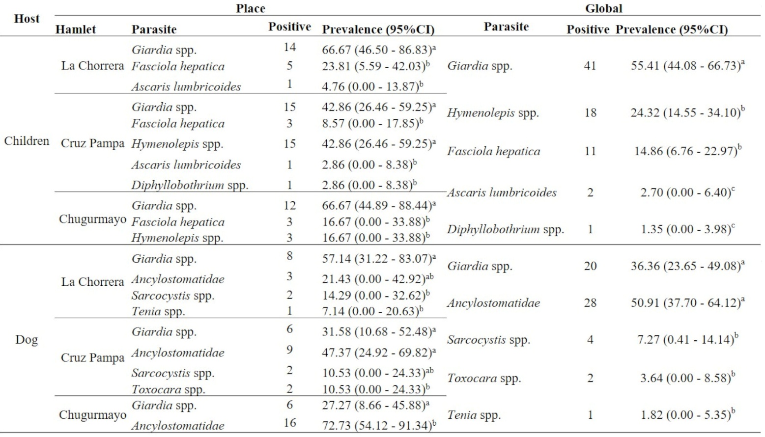 Table. III. Identification of parasite stages in children and dogs from the three hamlets in the Sorochuco district, Celendín (Cajamarca, Peru). a, b, c: Different superscript letters within the same column for each hamlet and host indicate statistically significant differences in parasite occurrence (Kruskal-Wallis test followed by Dunn’s post hoc test, p < 0.05).