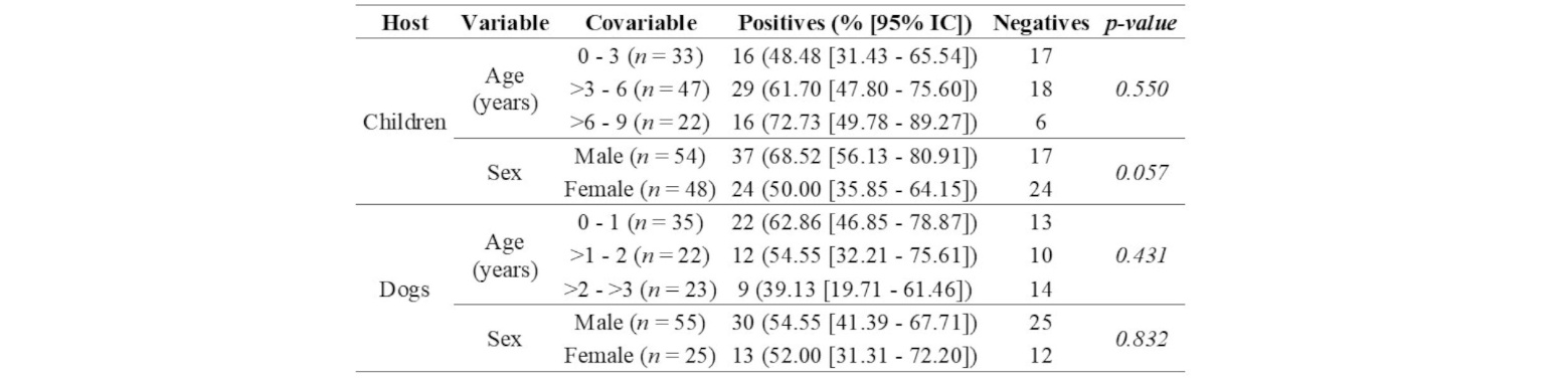 The ages of the evaluated children ranged from 1.5 to 9 years (mean ± standard deviation: 4.90 ± 2.13; median: 5; mode: 6). The highest parasite prevalence was observed among children aged 6 to 9 years and among males. However, no statistically significant association was found between parasite presence and either age or sex (p > 0.05). In dogs, age ranged from 0.17 to 8 years (mean ± standard deviation: 2.14 ± 1.71; median: 2; mode: 1). The highest prevalence occurred in dogs younger than one year and in males; nevertheless, neither age nor sex was significantly associated with parasite presence in this species (p > 0.05) (Table II).