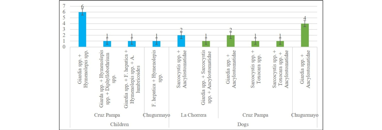 Figure. 3. Occurrence of polyparasitism—defined as the presence of two or more types of parasites—in children and dogs from the three evaluated hamlets in the Sorochuco district, Celendín (Cajamarca, Peru).
