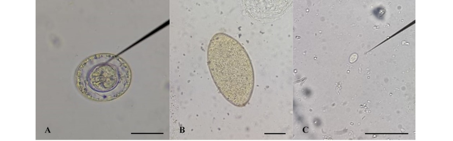 An initial analysis was performed using direct smear microscopy with physiological saline solution. Subsequently, a portion of each sample was processed via the natural sedimentation method (Rojas-Moncada et al., 2024) and examined under a stereoscope equipped with halogen light at 2× to 4× magnification for the detection of trematode eggs. Another portion was processed using the technique described by Faust et al. (1939) to observe protozoa such as Giardia spp. or Sarcocystis spp. For nematode detection, samples were processed using the Sheather flotation technique (Sheather, 1923). Observations were conducted under an optical microscope at 40× magnification. Parasite eggs, cysts, oocysts, and sporocysts were identified based on their morphological and morphometric characteristics, following established descriptions (Dubey et al., 2015; Bogitsh et al., 2018; Miró and Bowman, 2018; Leventhal and Cheadle, 2019).