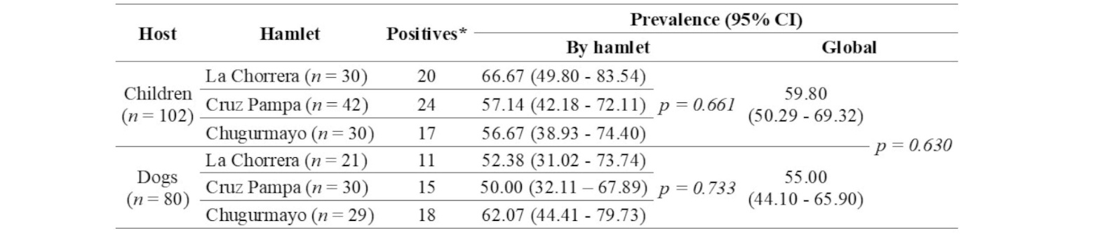 Children were the most frequently infected individuals across the three hamlets in the Sorochuco district, Celendín (Cajamarca, Peru), with a prevalence of 59.80% (95% CI: 50.29–69.32), compared to dogs, which showed a prevalence of 55.00% (95% CI: 44.10–65.90). No statistically significant differences in parasite prevalence were observed among the hamlets for either children or dogs (p > 0.05) (Table I).
